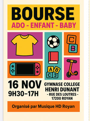 Bourse ado enfant baby : vêtements de 0 à 16 ans ou de grossesse, petite et grosse puériculture, livres, jeux, jouets, cd, dvd…console jeux, hifi, sports