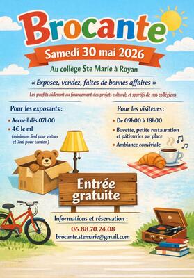 L’équipe, personnels et enseignants, du collège ste marie vous invite, professionnels et particuliers, à faire le plein de bonnes affaires dans une ambiance conviviale. Entrée gratuite pour les visiteurs. Buvette, petite restauration et pâtisseries en vente sur place au profit des collégiens pour aider au financement des projets culturels et sportifs.
