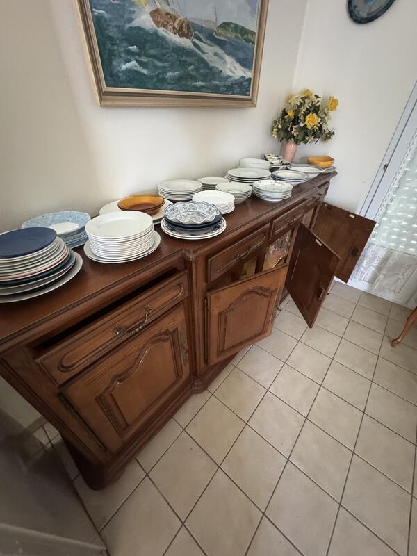 vaisselles (verres par lot, assiettes lots et unités, ramequins), canapé, tableau, commode, meuble
