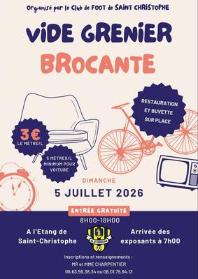 L' association sportive football saint christophe organise son vide grenier le dimanche 5 juillet 2026 de 8h00 à 18h00 au stade de football de saint christophe.