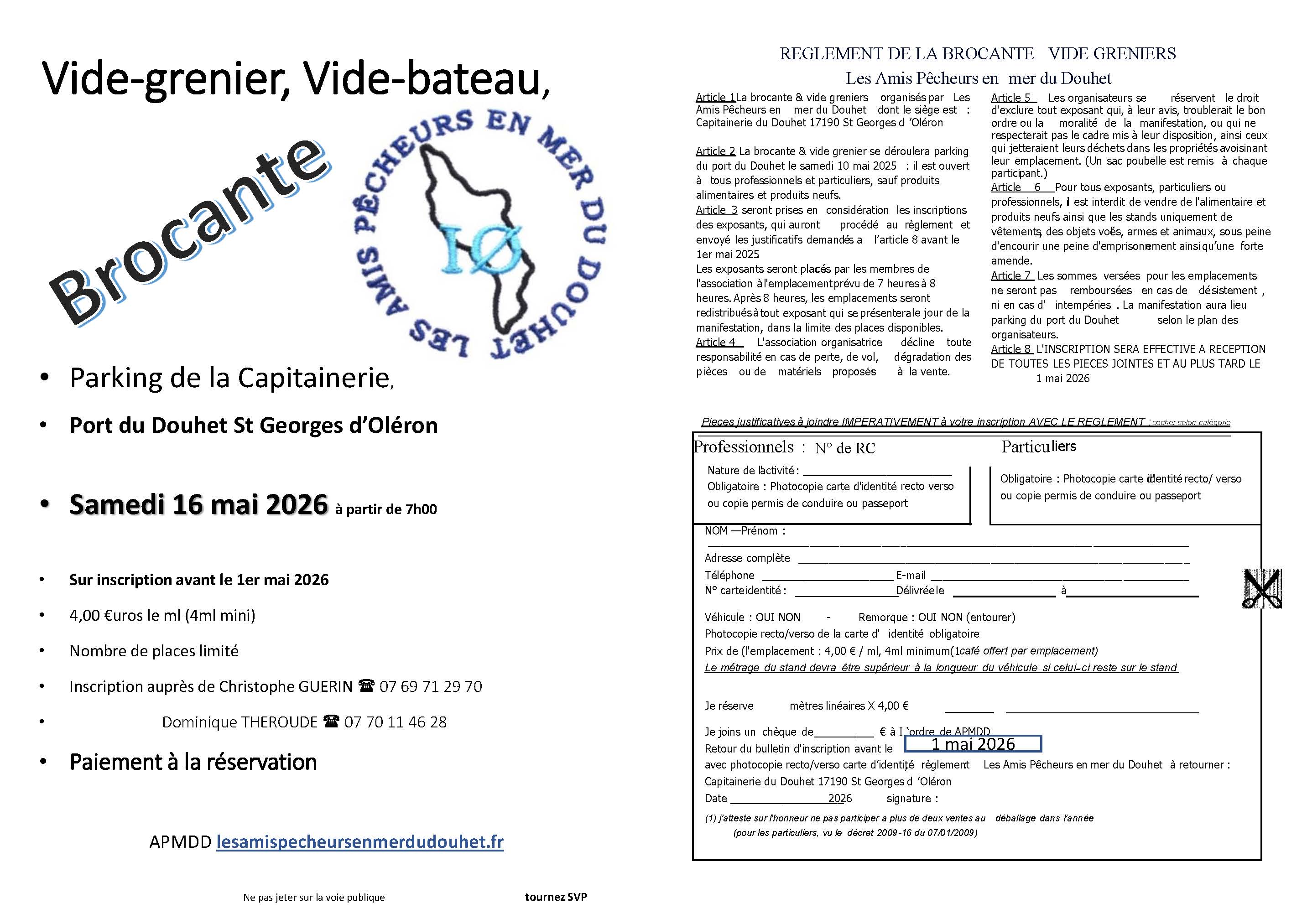 L'association les amis pêcheurs en mer du douhet organise le 16 mai 2026 leur brocante annuelle sur l'esplanade de la capitainerie du douhet à st georges d'oléron (17).