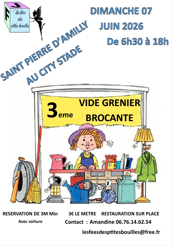 Après les superbes journées que nous avons passé les années précédentes, l’association les fées des p’tites bouilles organise son 3ème vide grenier/brocante, le dimanche 07 juin 2026 au city stade de saint pierre d’amilly de 6h30 à 18h.