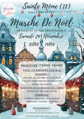 Le samedi 29 novembre, de 10h à 19h, la salle des fêtes de sainte-même (17) vous accueille pour son marché de noël artisanal et gastronomique.