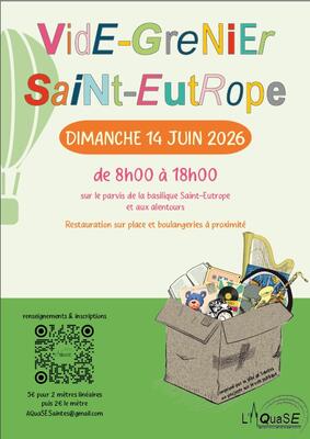 Le grenier est plein à craquer, il n'y a plus de place dans le garage, vos chaises de jardin sont démodées, vous voulez vous débarrasser de votre sommier, le vélo de la p'tite dernière est trop petit... ? C'est le moment de tenir un stand à la brocante. Ça tombe bien, l'association du quartier saint-eutrope organise un vide-grenier le 14 juin, autour de la basilique saint-eutrope ! Un food truck sera présent sur place ! Réservation : remplissez ce formulaire avant vendredi 12 juin 23h59 ! Emplacements : 3 secteurs sont disponibles autour de la basilique, à choisir lors du remplissage du formulaire. Parlez-en à vos voisins pensez aussi à visiter notre page facebook! On vous attend nombreux !!!