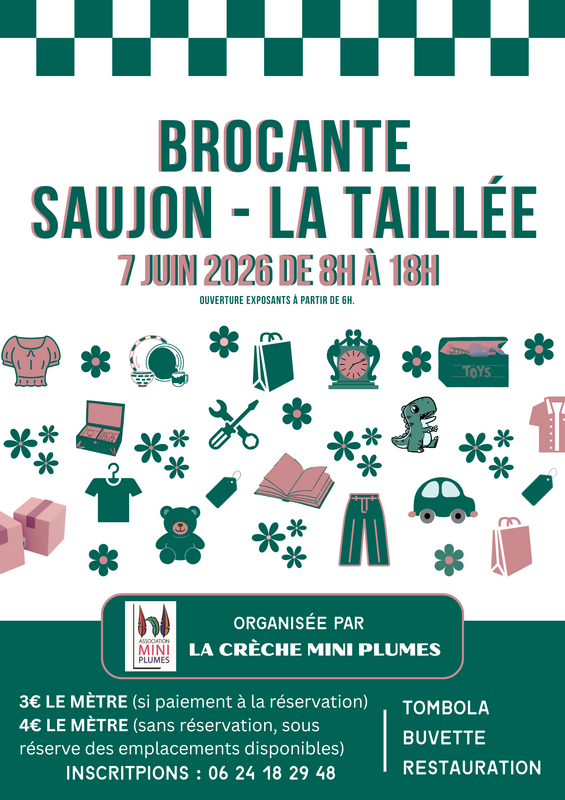 l'association crèche mini plumes vous invite à sa brocante, qui se tiendra de 8h à 18h à la taillée, à saujon. Venez dénicher des trésors et bonnes affaires parmi de nombreux exposants !