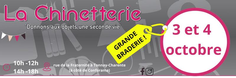Rendez-vous vendredi 3 et samedi 4 octobre pour la grande braderie de la chinetterie de 10h à 12h et de 14h à 18h zac de la fraternité à côté de conforama à tonnay-charente.