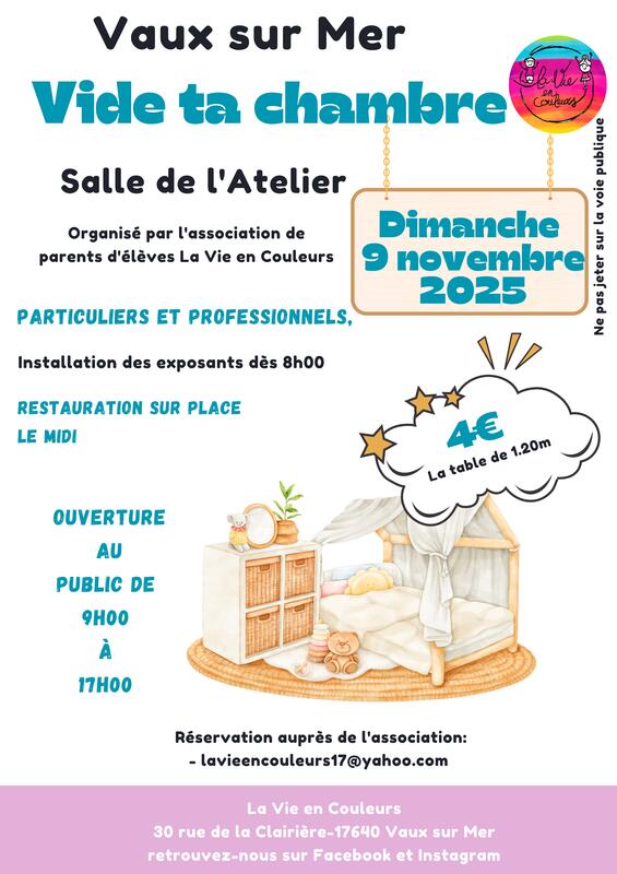 La vie en couleurs, association des parents d'élèves de l'école de vaux-sur-mer, organise un vide ta chambre le dimanche 9 novembre 2025, salle de l'atelier à vaux-sur-mer. Ouverture au public de 9h à 17h buvette et restauration sur place