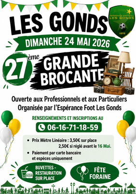 27ème brocante organisée par le club de foot de l'ef les gonds. Venez passer un week-end festif et convivial en famille ou entre amis ! Au programme : chiner, se divertir et se régaler avec la prés...