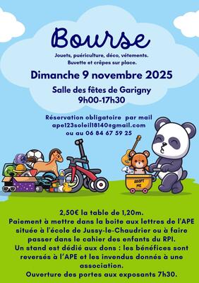 Bonjour, nous organisons une bourse aux jouets vêtements pour enfants dans la salle de fêtes de garigny, buvette sur place ainsi qu’une vente de crêpes.