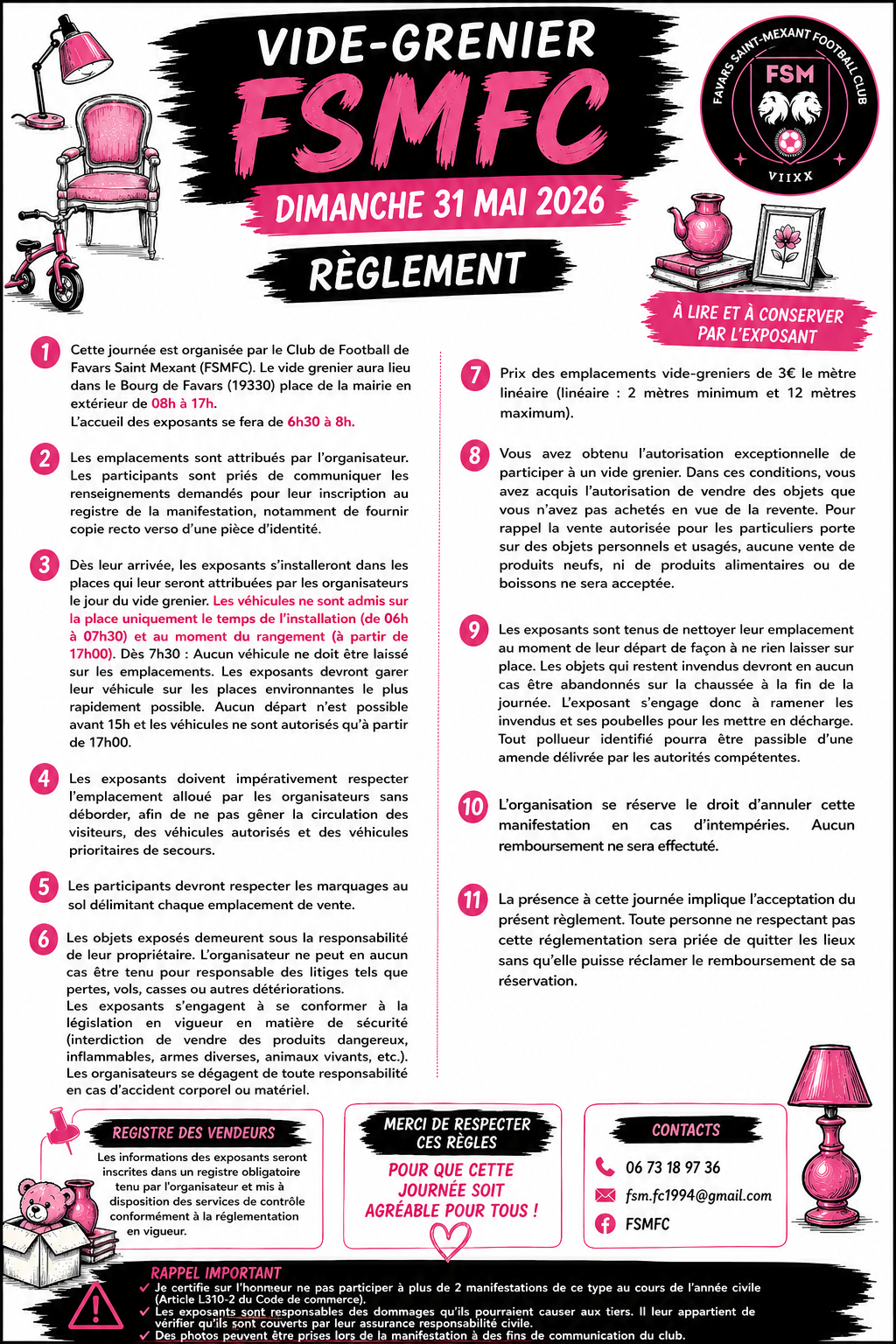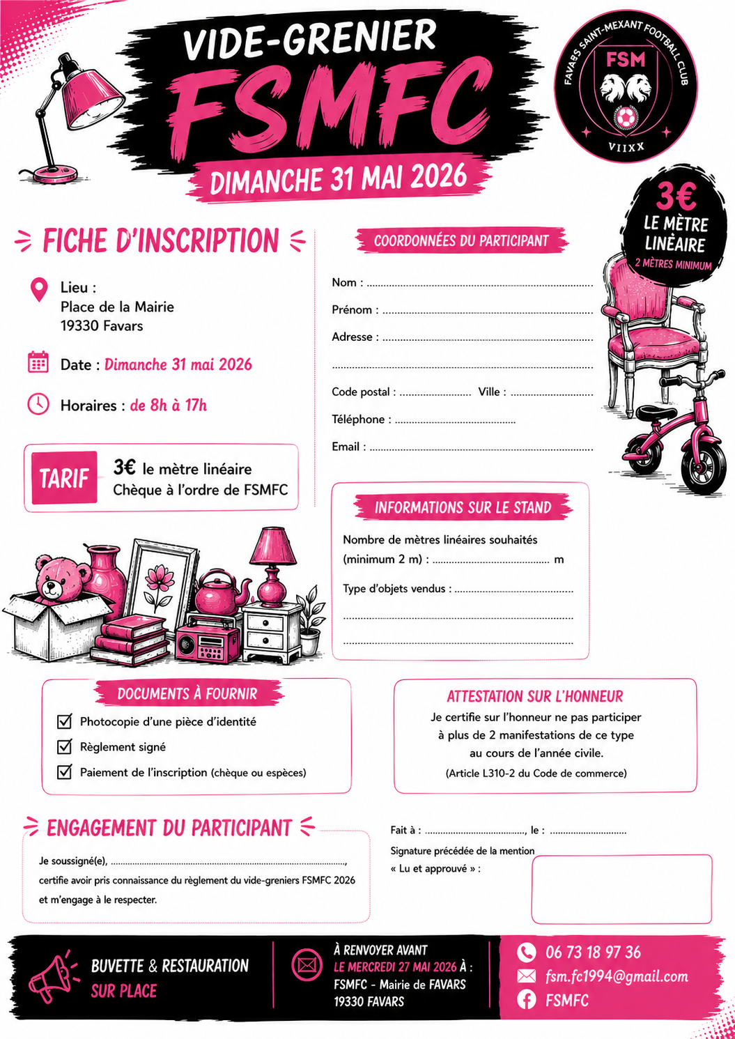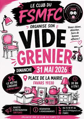 Le favars saint-mexant football club (fsmfc) organise un vide-greniers le dimanche 31 mai 2026 à la place de la mairie de favars (19330). Ouverture au public de 8h à 17h. Buvette et restauration sur place toute la journée. Ambiance conviviale et familiale.