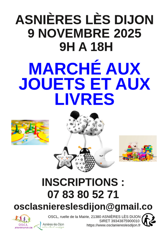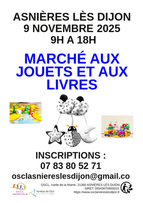 Plutôt que de vous précipiter pour aller choisir un jouet ou un livre dans les grands magasins du neuf, venez faire plaisir aux enfants et aux grands, ce dimanche 9 novembre 2025 au marché des jouets et des livres, organisé par l'association dynamique de votre village : l'oscl (office des sports de la culture et des loisirs). De 9h00 à 18h00.