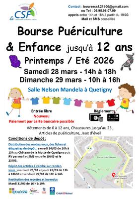 Vêtements de saison printemps été jusqu'à 12 ans, matériel de puériculture, jeux d'éveil ....Samedi 28/03 de 14 à 18h et dimanche 29/03 de 10 à 16h.
