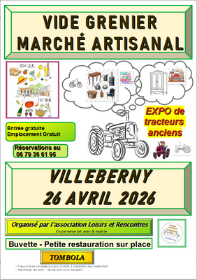 L'association loisirs et rencontres organisent son vide-grenier et marché artisanal annuel, il existe depuis 2011, il a grandi pour atteindre plus de 50 exposants l’année passée. Nous avons une buvette et de la restauration. Une tombola au profit de l’association, avec un panier garni et plusieurs lots. Une exposition de tracteurs anciens avec une démonstration de moulin à farine. L’entrée est gratuite, les toilettes de la salle sont à votre disposition.