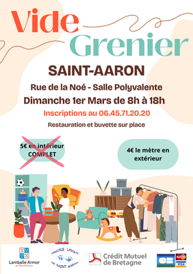 L'amicale laïque de saint-aaron organise son traditionnel vide grenier annuel à la salle polyvalente de saint-aaron (rue de la noé) avec des exposants en intérieur et en extérieur. L'accueil des visiteurs se fera de 8h à 18h avec restauration et buvette sur place (galettes saucisses, frites, crêpes maison, ...)