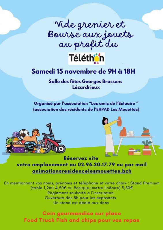 L'association des résidents de l'ehpad les mouettes organise un vide-grenier et une bourse aux jouets à la salle georges brassens de lézardrieux le 15 novembre au profit du téléthon. Coin gourmandise et food truck fish and chips sur place.