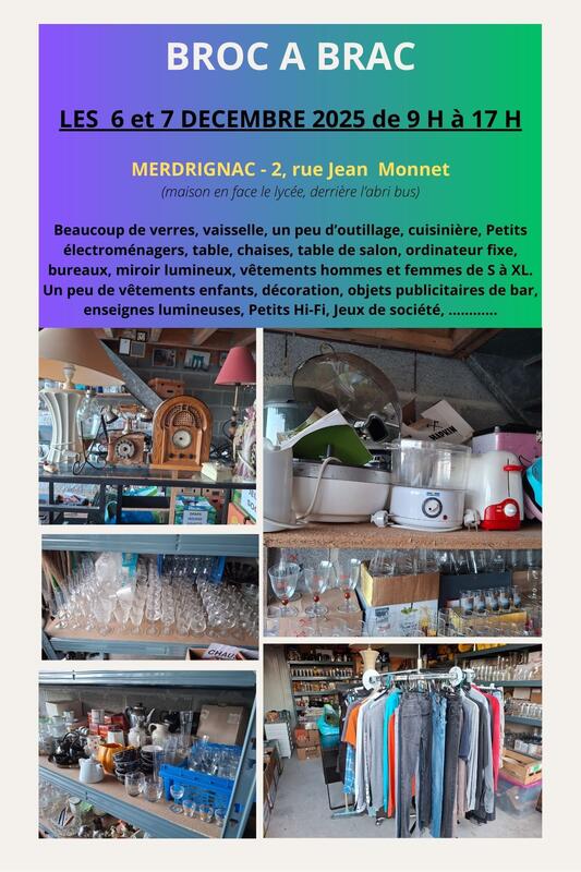 beaucoup de verres, vaisselle, un peu d’outillage, cuisinière, petits électroménagers, table, chaises, table de salon, ordinateur fixe, bureaux, miroir lumineux, vêtements hommes et femmes de s à xl. Un peu de vêtements enfants, décoration, objets publicitaires de bar, enseignes lumineuses, petits hi-fi, jeux de société, jouets, .......