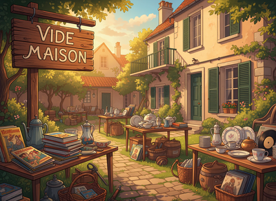 nombreux objets à vendre : meubles, décoration, outils, jeux, bd, disques, etc.