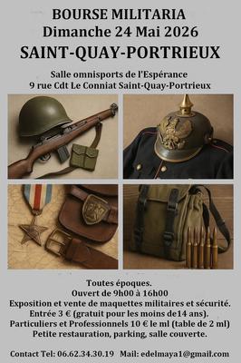 Bourse militaria à la salle couverte omnisports de l'espérance 9 rue cdt le conniat saint-quay-portrieux ouvert de 9h à 16h. Entrée 3€. Gratuit pour les moins de14 ans. Toutes époques. Exposition et vente de maquettes militaires et sécurité. Professionnels et particuliers 10€ le ml (tables de 2m); petite restauration, parking. Notre bourse couvre toutes les époques, de l'antiquité à nos jours. Cet événement est également une excellente occasion de rencontrer d'autres passionnés, d'échanger des connaissances et de partager des anecdotes historiques. Possibilité de venir la veille pour installer.