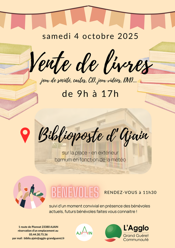 Venez prendre le temps de découvrir ou redécouvrir la biblioposte d'ajain et repartez avec un ou plusieurs livres à prix réduit ! D'autres exposants seront aussi présents pour que vous puissiez trouver votre bonheur en terme d'ouvrage littéraire !