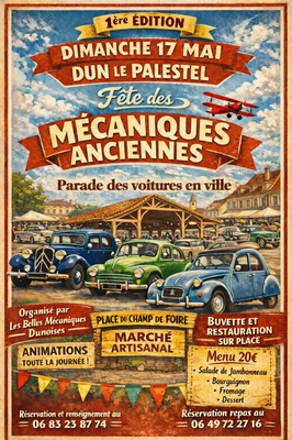Expositions de voiture anciennes, marché d'artisanats et commerçants local, entrée libre, buvette et restauration sur place, un menu le midi pour 20€ avec salade de jambonneau, bourguignon, fromage, dessert
