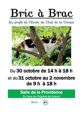 L'association de l'ecole du chat de la creuse organise un bric à brac du jeudi 30 octobre apres midi de 14 h à 18 h et du 31 octobre au 2 novembre de 9 h à 18 h - salle de la providence (à proximité de l'hôpital) à guéret.