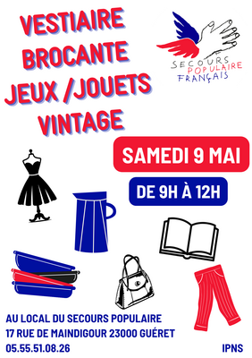 Le secours populaire de guéret sera ouvert au public le samedi 9 mai de 9h à 12h.