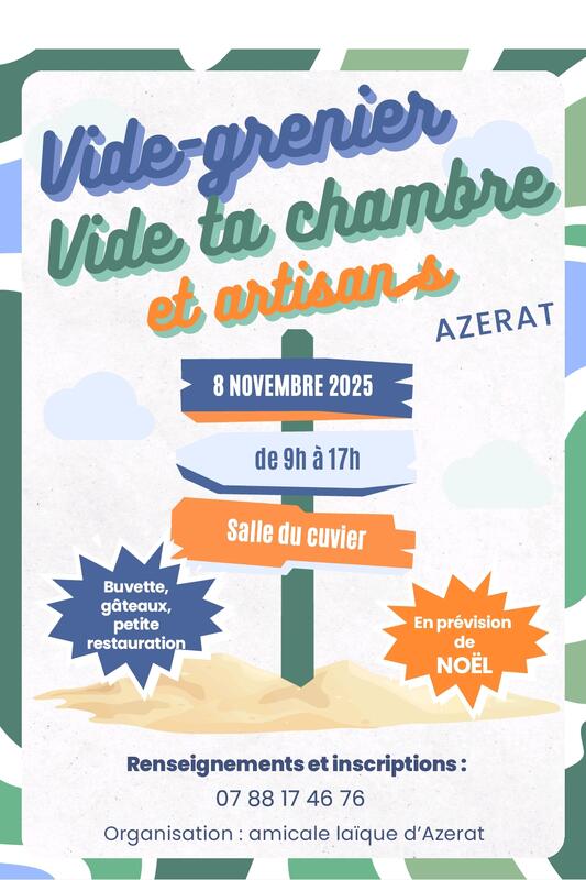 L'amicale laïque de azerat propose un vide grenier vide ta chambre et artisanat , plutôt tournée vers des objets , vêtements,jouets que l'on peut offrir à noël