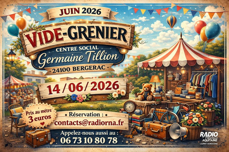 Vide-grenier à bergerac – juin 2026 le grand rendez-vous des chineurs et des bonnes affaires arrive ! Dimanche 14 juin 2026 centre social germaine tillion – 24100 bergerac venez flâner, chiner, vendre ou tout simplement passer un bon moment dans une ambiance conviviale et festive ! Objets vintage, déco, vêtements, livres, trésors cachés… il y en aura pour tous les goûts ! Organisé par votre radio locale, avec une ambiance chaleureuse garantie ! On vous attend nombreux pour une belle journée au cœur de bergerac !