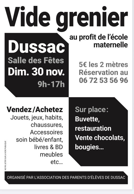 Le foyer laïque de l’ecole de dussac vous propose un vide grenier le dimanche 30 novembre à la salle des fêtes de dussac.