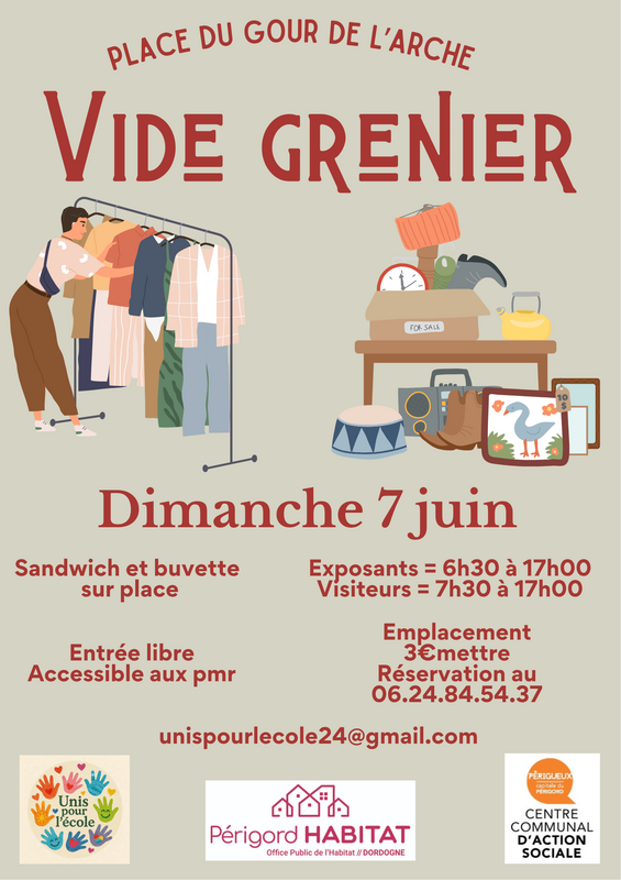 l'association unis pour l'école, organise un vide grenier avec exposant le 7 juin, place du gour de l'arche.