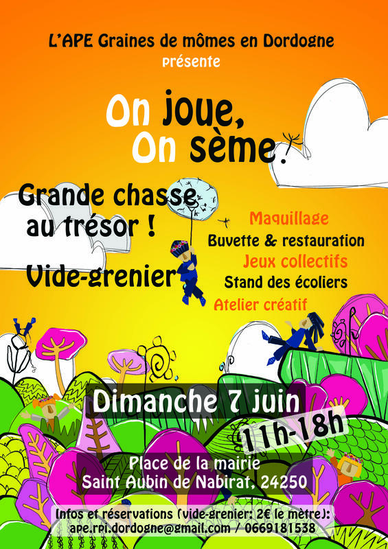 Fête ludique autour du printemps et du jeu collectif organisée par l'ape de nabirat /saint martial /saint aubin. Grande chasse au trésor, ateliers créatifs, jeux collectifs, vide grenier, buvette et restauration, vente de plants et créations des écoliers. Les bénéfices de la journée sont versés au profit des élèves et des écoles.