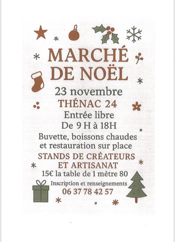 Marche de noël à thenac dimanche 23 novembre 2025..Créations et artisanat. Possibilités de partager un bon moment , buvette, boissons chaudes, restauration sur place