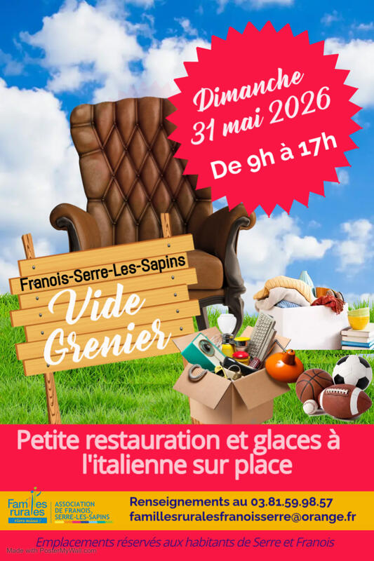 L'association familles rurales de franois/serre-les-sapins organise vide grenier annuel entre les deux villages de franois et serre-les-sapins. Petite restauration et glaces à l'italienne sur place.
