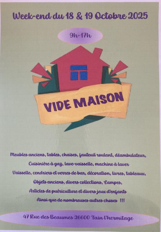 Vide maison particulier.Le 18&19 octobre 9h/17h tout est décrit dans l’annonce.Beaucoup de choix à vendre. Il y en a pour tous les goûts! Antiquités également. Le mieux c’est de venir voir sur place.