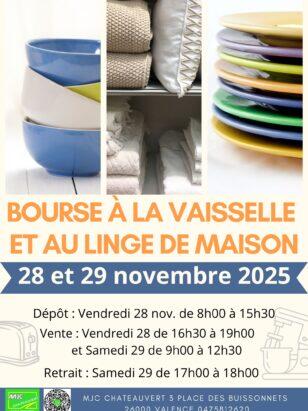 Vendredi 28 et samedi 29 novembre, nous organisons la traditionnelle bourse à la vaisselle et linge de maison à la mjc châteauvert !