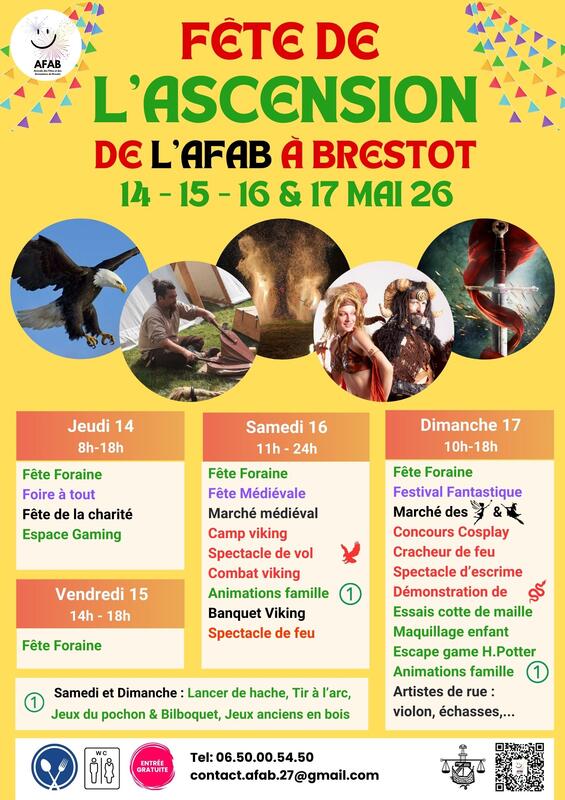 samedi 16/05/26: fête foraine, fête médiévale spectacles d'aigles, combat de viking, spectacle de feu, diner et animations viking, marché médiéval, lancer de haches, tir à l'arc et jeux en bois.