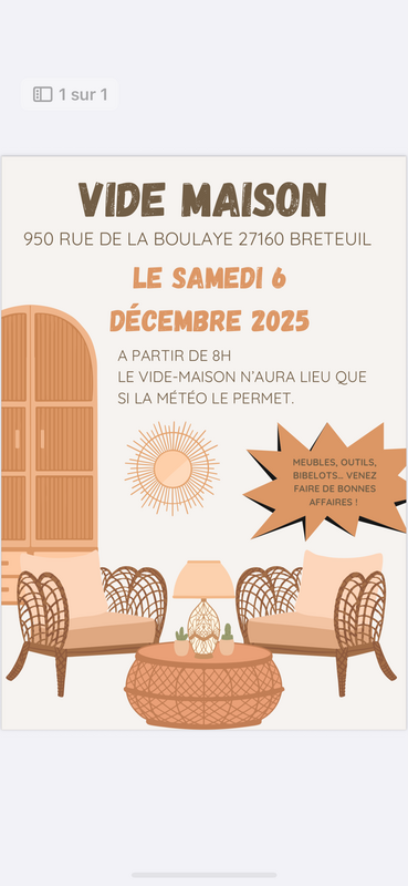 Bonjour nous organisons un grand vide maison -atelier . Il y aura de nombreuses choses a découvrir : meubles ; bibelots ; matériel professionnel ; outillage ; pièces de voitures anciennes et modernes et pleins d’autres choses encore… le touts à petit prix, nous vous attendons nombreux avec plaisir !