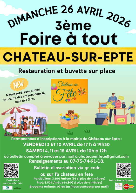 Foire à tout de château sur epte organisée par l'association château en fête. L’année dernière, c’est 100 exposants et une foule de visiteurs qui sont venus participer à cette belle journée et cette année nous visons encore plus haut !! Grande nouveauté, la brocante des enfants: 4€ les 2m, un espace et une organisation pensée pour eux ! Alors si vous aussi vous souhaitez en profiter, ne tardez pas à vous inscrire ! ️