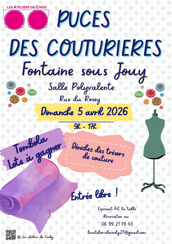 4ème édition de la puce des couturières à fontaine-sous-jouy ! Fontaine-sous-jouy dimanche 5 avril de 9h à 17h un événement exceptionnel à ne pas manquer ! Venez découvrir de nombreux stands dédiés à la couture : tissus, mercerie, créations artisanales et trésors à chiner buvette avec gâteaux maison tombola ambiance chaleureuse et conviviale garantie !