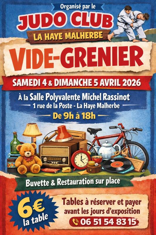 Foire à tout organisée par le judo club de la haye malherbe les 4 et 5 avril 2026 de 9h à 18h à la salle des fêtes de la haye malherbe.