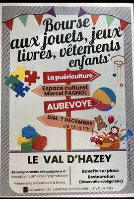 L'amicale du personnel communal du val d'hazey, organise sa bourse aux jouets et à la puériculture et vêtements jusqu'à 16 ans le dimanche 7 décembre 2025 de 9h à 17h, à l'espace culturel marcel pagnol d'aubevoye.