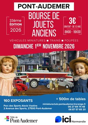 Le dimanche 1er novembre 2026, le miniature club de pont-audemer (mcpa) organise la 33ᵉ bourse de jouets anciens et miniatures au parc des sports alexis vastine.