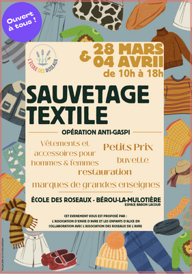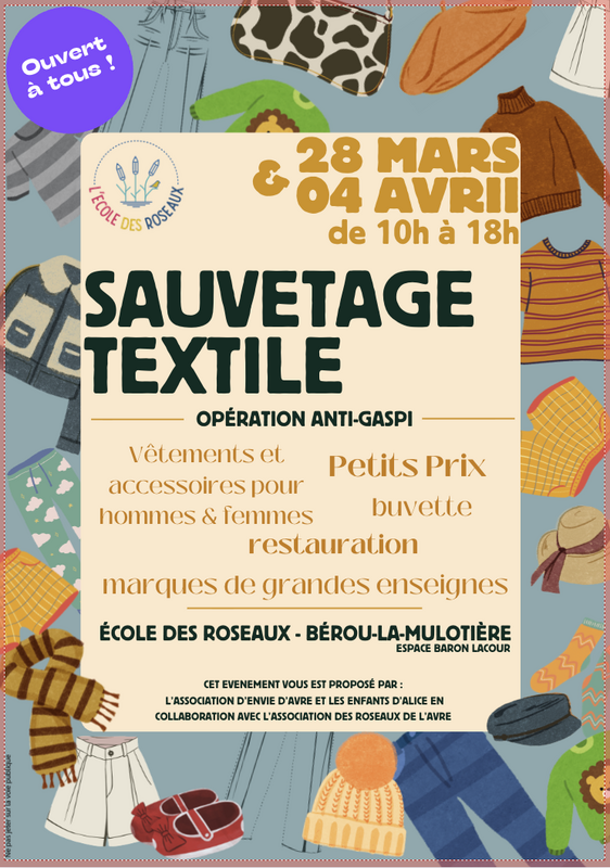 Vente solidaire de vêtements de fin de série ou avec des petits défauts de marques connues. Vêtements pour hommes et femmes. Buvette et restauration sur place. Organisé par l’association des roseaux de l’avre, l’association envi’d’avre et les enfants d’alice.