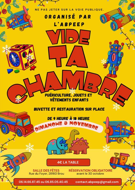 Nous organisons cette année notre premier vide ta chambre qui aura lieu de 9h à 18h à la salle des fêtes de brou le dimanche 9 novembre 2025.