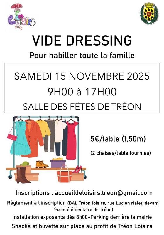 Tréon loisirs organise un vide dressing (vente de vêtements, sacs, chaussures d'occasion en bon état) le samedi 15 novembre 2025 de 9h à 17h à la salle des fêtes de tréon.