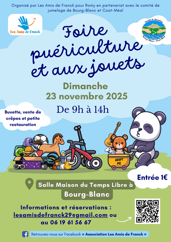 Foire à la puériculture organisé par l’association les amis de franck en partenariat avec le comité de jumelage de bourg-blanc et coat méal.