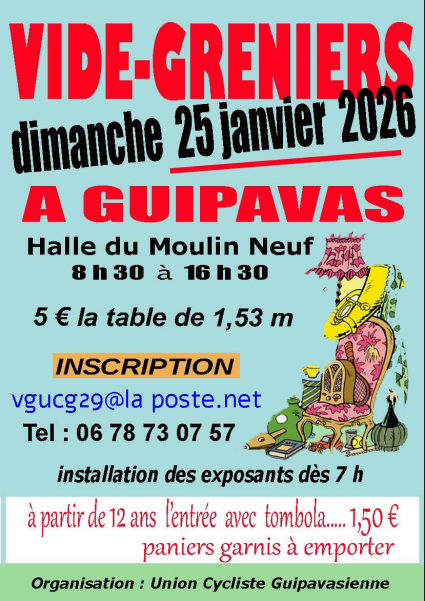 L'union cycliste guipavasienne organise son vide grenier le dimanche 25 janvier de 8h30 à 16h30 à la halle du moulin neuf à guipavas. Petite restauration sur places. Panier garni à gagner. Inscription sur ou .