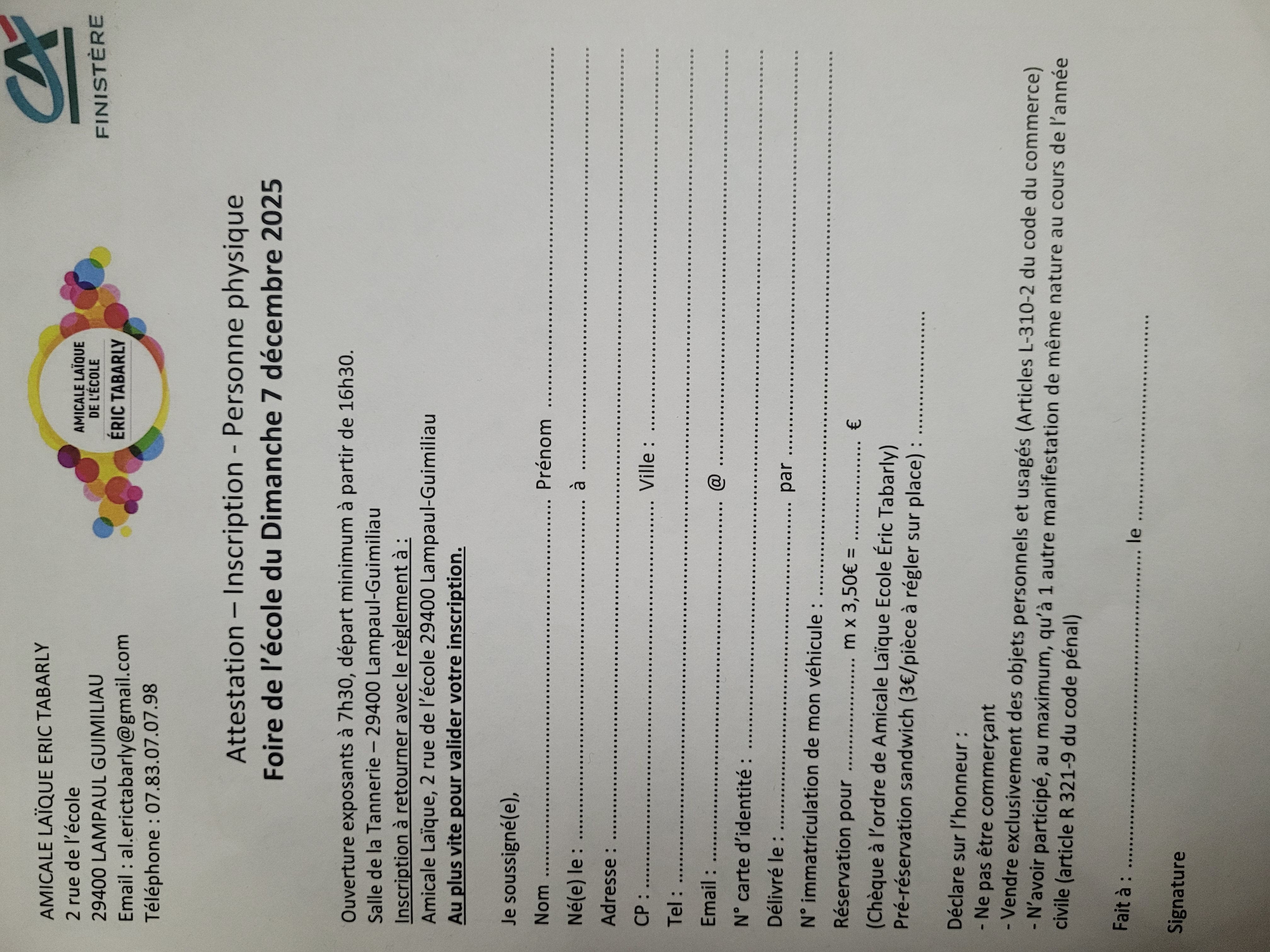 Installation exposants de 7h30 à 9h . Ouverture public de 9h à 16h30 . Entre 50 et 100 exposants .Buvette et restauration sur place . Réservation sur helloasso.Com/associations/amicale-laique-ecole-eric-tabarly ou par mail