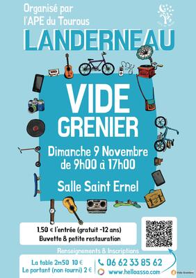 L'ape du tourous organise un vide-grenier à la salle saint ernel de landerneau le dimanche 9 novembre de 9h à 17h. Buvette et petite restauration sur place.
