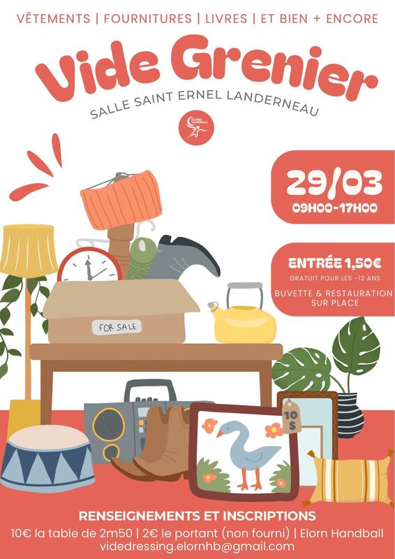 Elorn handball organise un vide grenier le dimanche 29 mars 2026 à la salle st ernel de landerneau